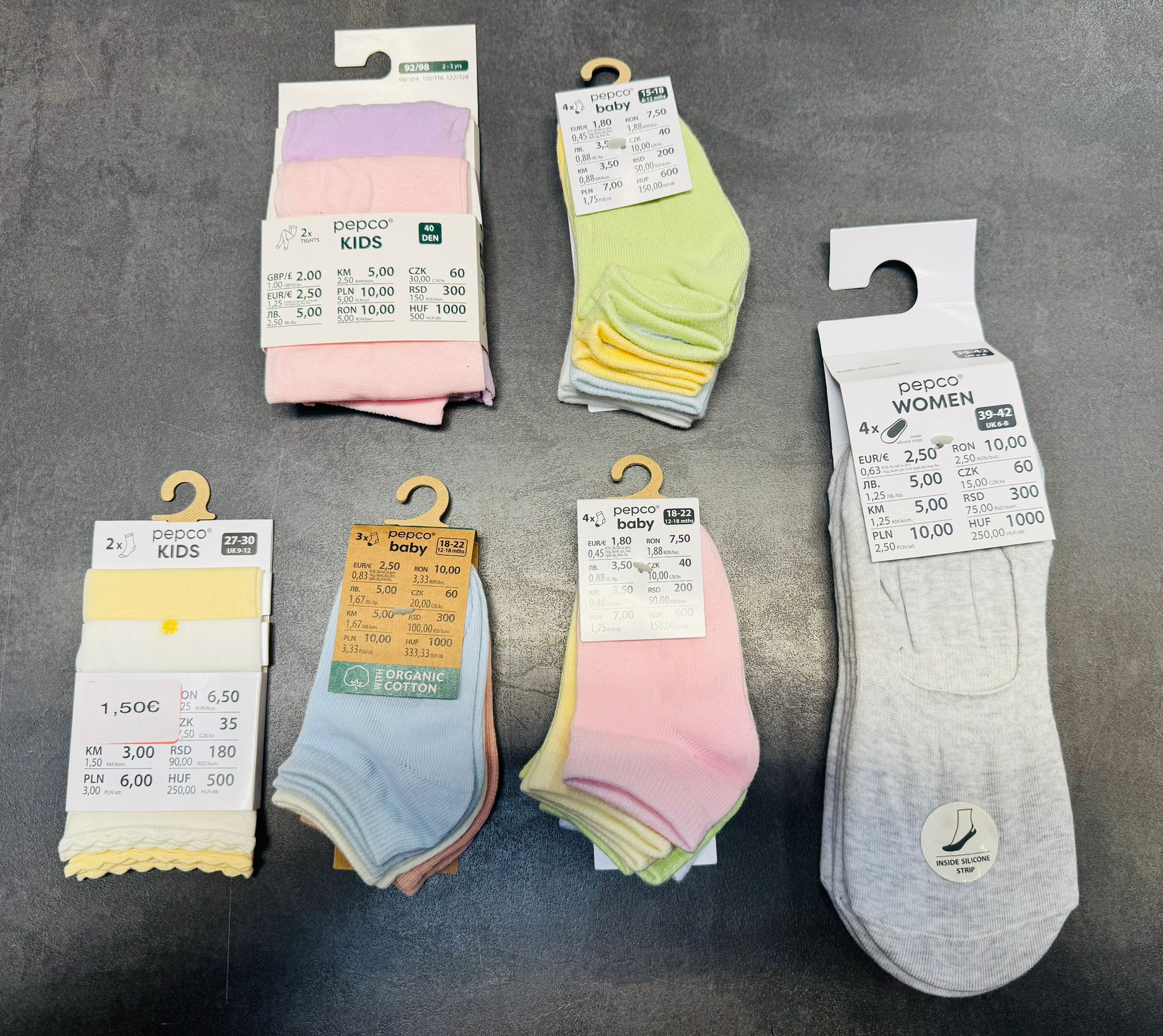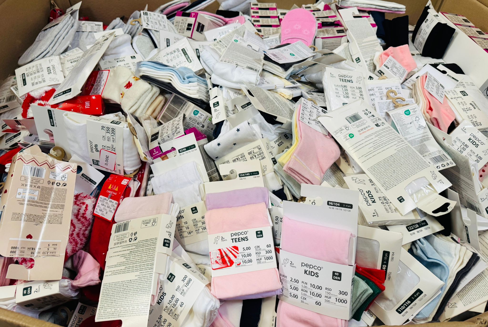 Antal: 14 005 stycken Pepco textilier & skor – allt En produkt! Shorts – Toppar – Strumpor – Skor mm. – 80 % barn - 20% kvinnor och män.. Textil 80% / 20% skor Antal: 14 005 stycken Volym: 11 pallar Vikt: 1 488 kg